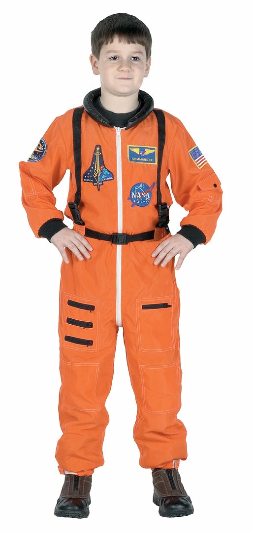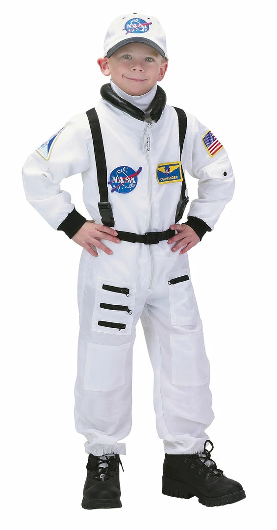 Top quality, white Astronaut Suit with NASA logos, patches and a black foam collar. Includes a white hat with NASA insignia on front and special zipper compartments. Functional pockets and Velcro leg straps for a comfortable adjustable fit.