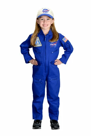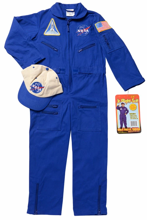 Your child will be all set to explore new frontiers in this great Jr. Flight Suit costume. One-piece jumpsuit, official-looking NASA embroidered cap, official NASA patches on jumpsuit and loaded with zipper pockets.