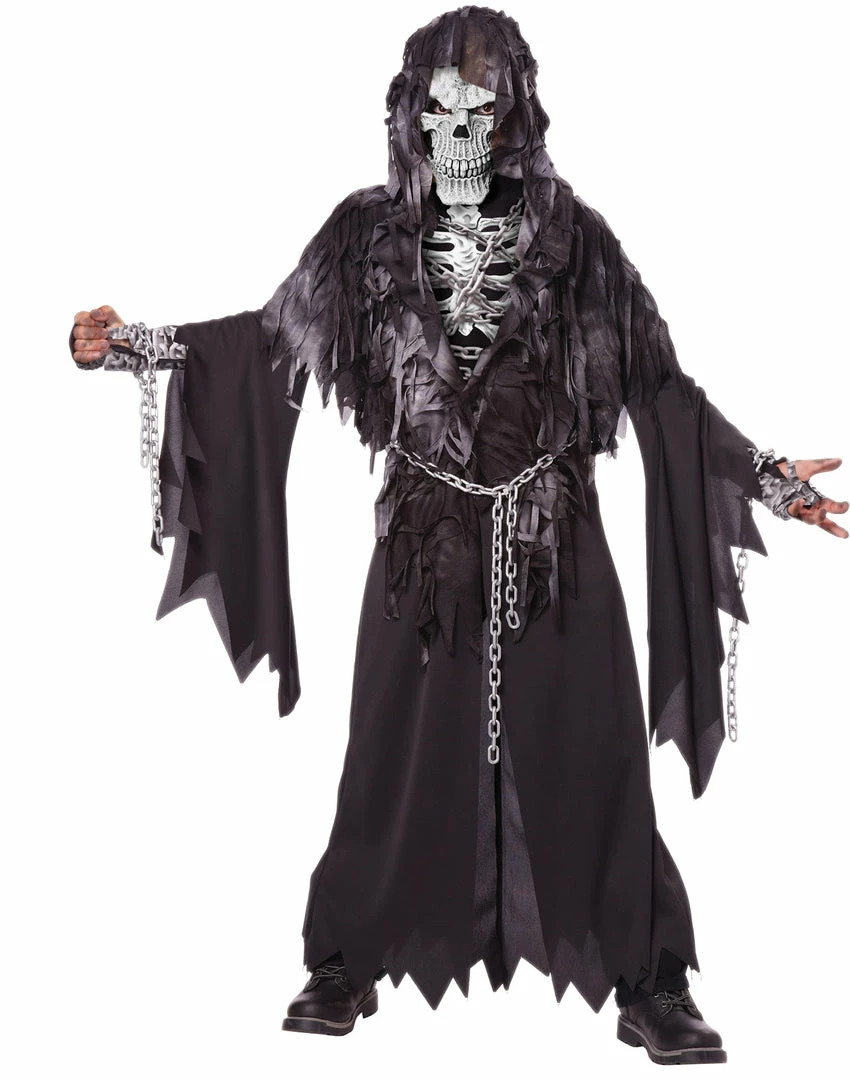 A great reaper-style costume for your child! Robe, character mask, hood with drape, printed cuffs, waist chain, and cuff chains. Chest bone and chains on chest are screen printed. Axe not included. size fits