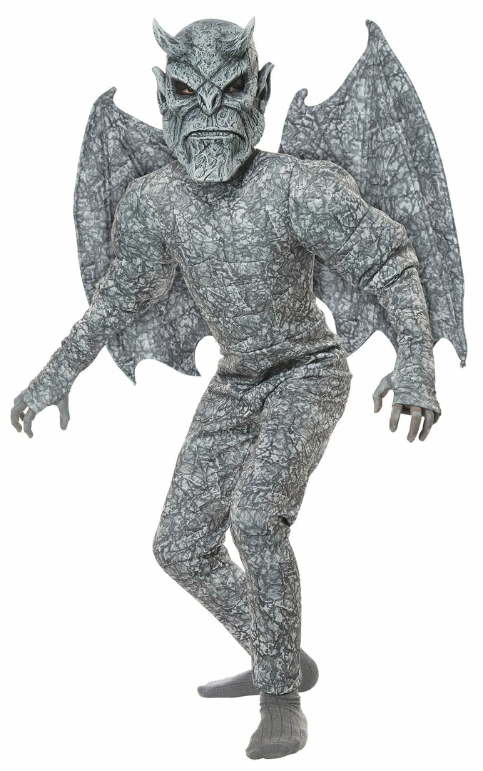 Transform into a fantastic medieval monster with this ghastly gargoyle costume. This scary boy’s costume includes a full body suit with upper body padding and thumb holes in the sleeves. Also included are the large bat-like wings and ominous full face mask with horns. The entire ensemble is made to resemble stone, as if the gargoyle just leapt from the flying buttresses right onto the streets to trick or treat for Halloween. A great Halloween costume for boys!