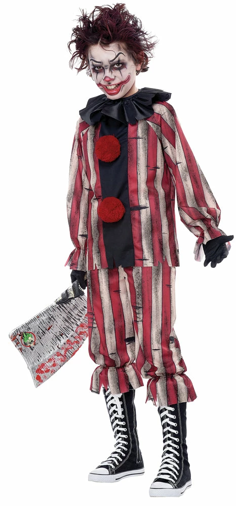 Who’s going to get the last laugh? Creepy and terrifying, this scary Nightmare Clown is not joking around! This costume includes a long sleeve red and white distressed striped shirt with 2 attached pom-poms, pants, ruffle clown collar and clown mask with elastic band. Red wig, black gloves, mallet and shoes are not included.