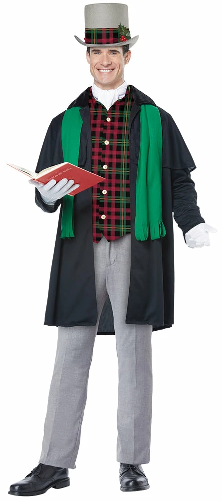 Spread holiday cheer while carrying a tune in this classic, Victorian inspired Christmas Caroler costume. Perfect for holiday plays or Christmas caroling in the neighborhood! Costume includes a black jacket, button down plaid vest, white ascot neck tie, green scarf, holly clip and a 3 piece to assemble top hat with band. Pants, book, white gloves and shoes are not included.
