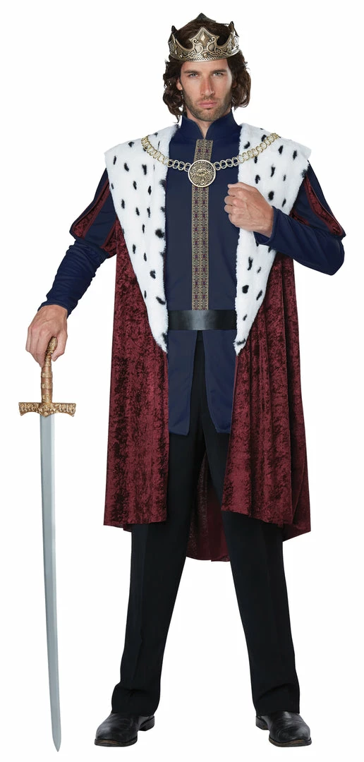 Dress up as a noble king this Halloween and rule the night! This regal adult costume features a dark blue tunic with brocade ribbon detail and a plush burgundy surcoat with a white faux-fur collar and puffed striped sleeves. Completing this stately look is the belt, gold medallion, and elaborate crown.