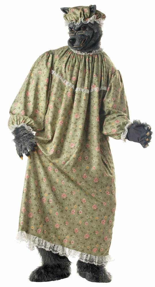 Oh, Grandmother, what big teeth you have! The Wolf Granny costume includes nightgown, wolf mask, gloves, shoe covers and cap. Glasses are not included.