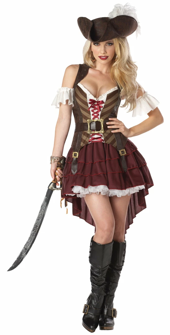 Conquer the seven seas and every pirate’s heart with this sexy costume! Top, sleeves, skirt, belt and hat. Sword and boots not included. Adult 1X/2X size fits sizes 16-18.