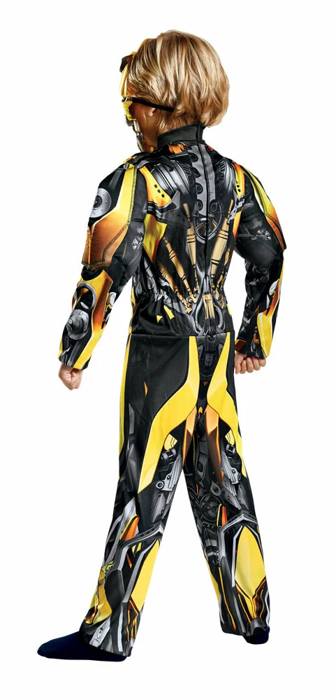 Your child can be his favorite Transformer with this Bumblebee Costume. Printed Jumpsuit with Muscle Torso and Arms, and Character Mask with elastic strap for a secure fit. The costume also has attached Shoulder Armor for a realistic Movie look. Officially Licensed Movie Costume.