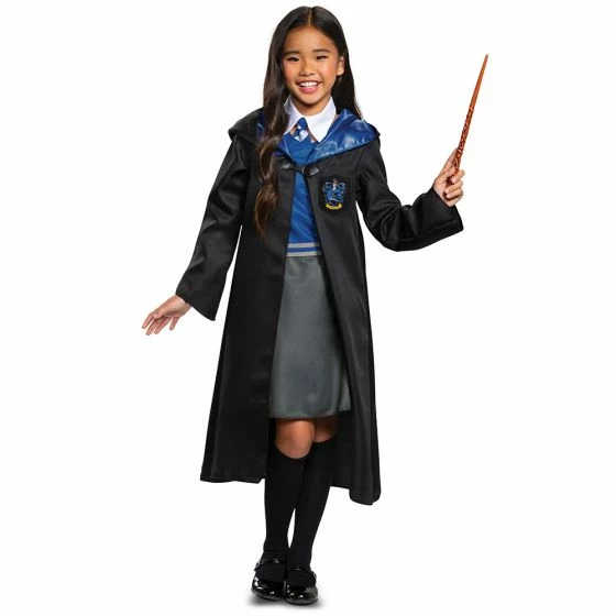 Make a dramatic entrance and show off your house colors. Your child can become part of the magical universe in this adorable Harry Potter Ravenclaw dress. Be one of the smart and witty students of Hogwarts Ravenclaw House and you will be mastering the magical spells in no time. Just add a Ravenclaw Robe to complete this Hogwarts student uniform! The Harry Potter Girl’s Ravenclaw Classic Dress features a sleeveless dress with separate white collar and striped tie. The one- piece dress is designed to look like a blue sweater vest with the Ravenclaw House crest patch and a gray skirt. Robe, Socks, shoes and wand not included.