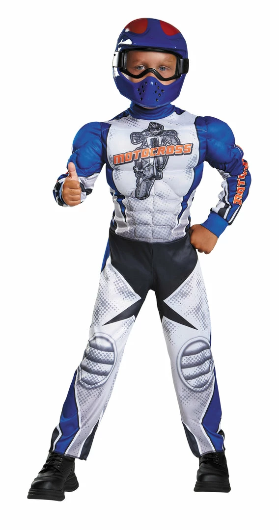 Become a motocross mean machine in our Motorcycle Rider Toddler Muscle Costume! Costume includes a one piece jumpsuit with detailed dangerous blue and white designs, with torso and arm muscles. Costume features a motocross racer with, motocross written on the front of the costume. Costume also includes helmet with matching blue and red design. (For Costume purposes only, this costume and helmet is not designed for safety)