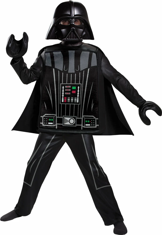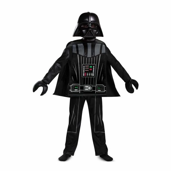 Boys will want to Join the dark side as the villainous Darth Vader and try to bring down the rebel alliance! Get ready for intergalactic battles! This Deluxe Darth Vader costume is perfect for Star Wars and Lego fans! The Lego Star Wars Darth Vader Lego Deluxe kids Costume features a mini-figure tunic with screen print, detachable cape, pants, character half mask and pair of hands.