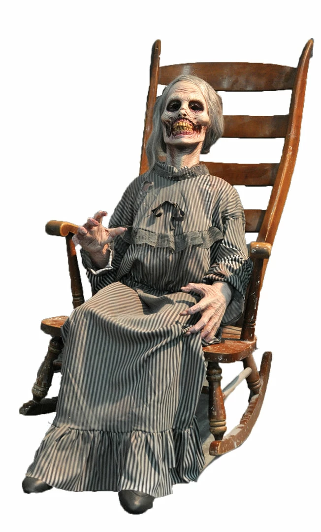 Perfectly preserved! This Mother slowly rocks back and forth as she contemplates your fate. This life-sized animated sitting prop has a foam-filled latex body with metal armature and heavy duty electric motor. She has a grey wig and long dress, with hand painted detailing on her face and hands. You supply the rocker! Soundtrack CD is included; provide your own CD player. See our video!