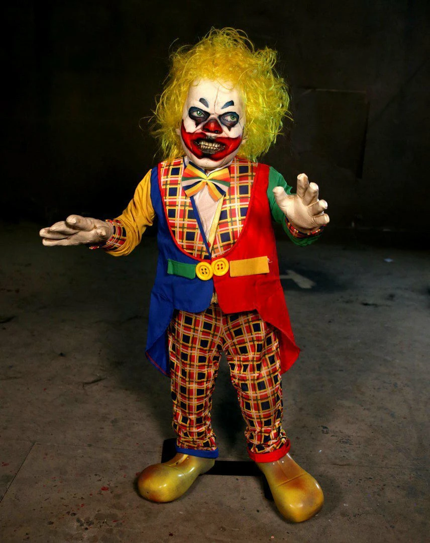 This mini clown is a little tipsy!, He rocks side to side, trying to keep his balance as he clowns around. Whacko is one crazy little clown! This demented mini clown is part of our Frightronic line, featuring all electric ANIMATRONIC movement. Just plug Whacko in and watch him move and dance back and forth. He stands 48 inches tall, made of foam filled latex with armature and is hand painted. He would be perfect in Haunted Houses, for Home Haunters, Halloween Parties, retail, or for you scary circus, clown or toy room scene.