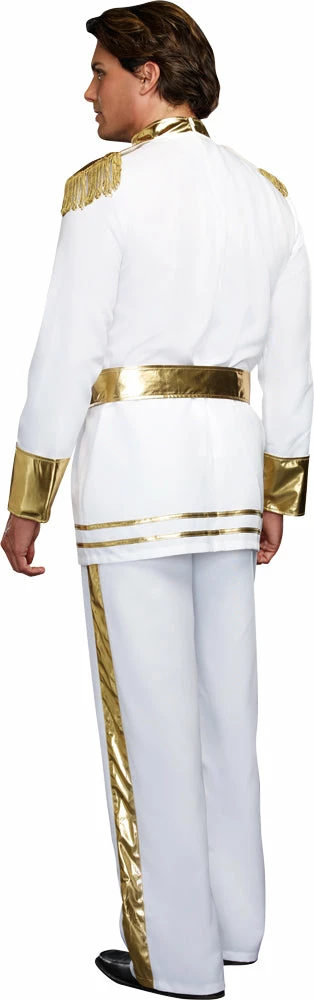Finding a princess can be hard to do not every fair maiden can fit in that glass shoe! Poised like the prince you are couple up with your princess as you head out into the night in this white tunic with gold accents and white elastic waist pants. 100% Polyester. 36 inches-38 inches and chest 42 inches-44 inches.