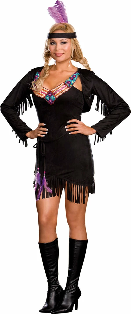 Ultra suede dress with beaded neckline and fringe hem. Includes long sleeved matching shrug with fringe detail on the sleeves headpiece with feathers and belt with beaded and feather trim.