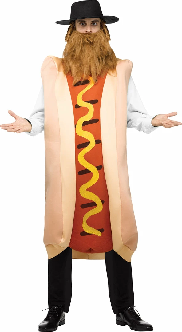 A great comical gag costume that will leave anyone who sees you hungry for more! Cloth-covered foam tunic looks like a grilled hot dog with mustard and comes with a rabbi hat with payis, and beard. Add your own black pants. Fits men up to 6 feet, 200 lbs.