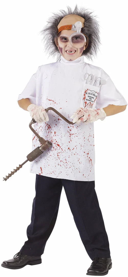 Blood spattered dentist smock comes with headpiece with attached hair, headband, and attachable magnifier, and includes pretend EVA dentist pocket tools and gloves. Drill is not included. Add your own black pants. Teen fits up to 5’10 inches 160lbs.