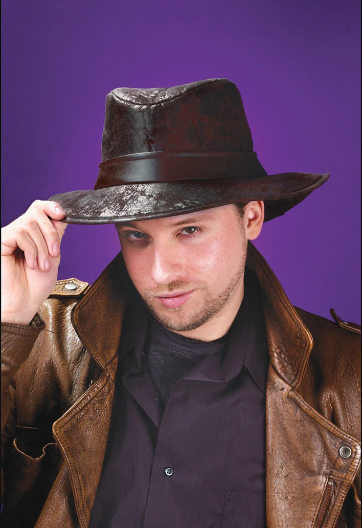 Used leather-look hat with band. Sewn edge gives these polyester and foam hats the best look possible. One size fits most.