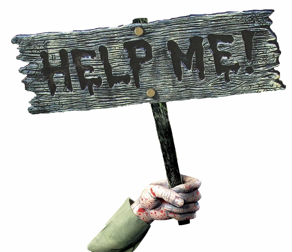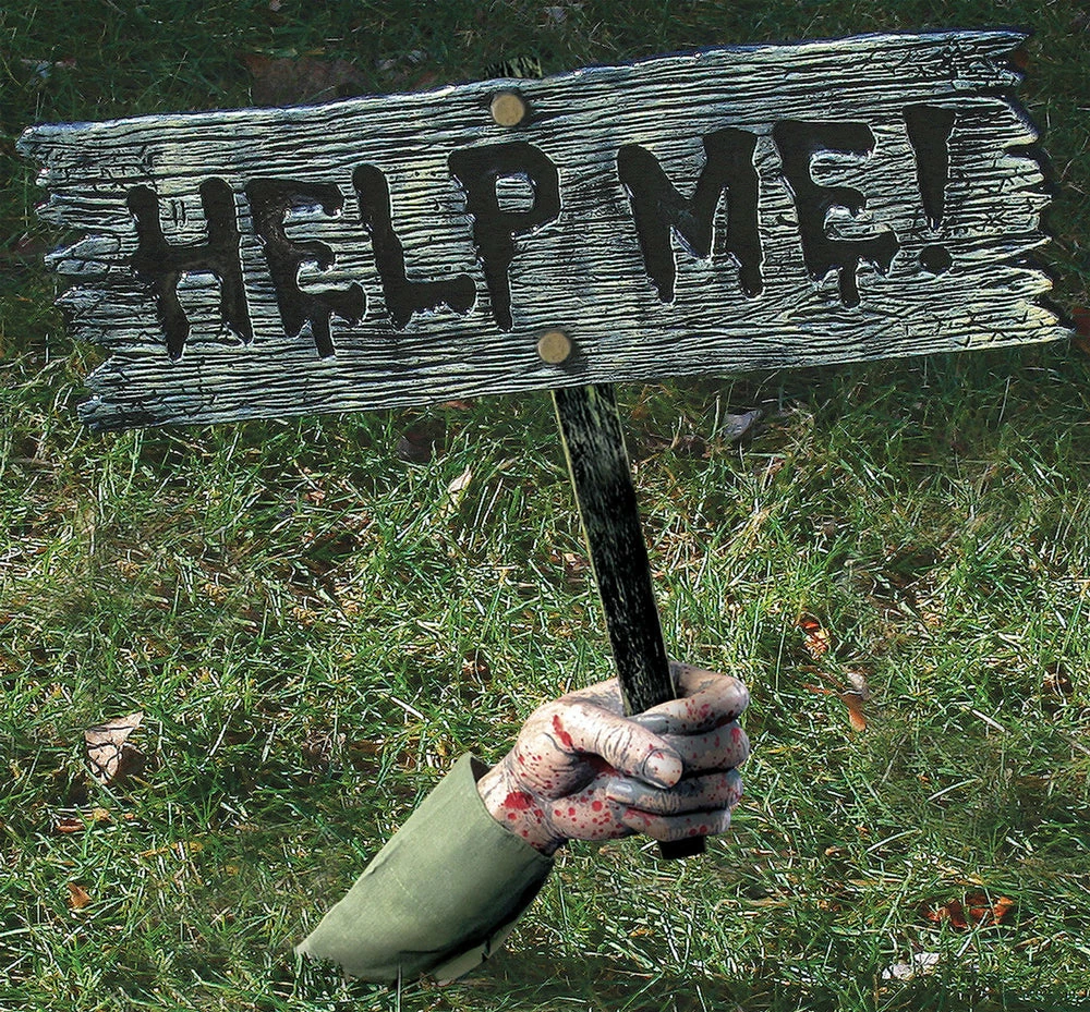 Give your guests the creeps with this message from the dead! An arm appears to be reaching up from the grave with a warning sign to all passersby! Includes the arm, sign with pole, and ground stake. Add a few tombstones and you have a spooky outdoor graveyard scene. Sign says Help Me! Signs measure 18 inches tall x 19 inches wide x 3 inches deep.