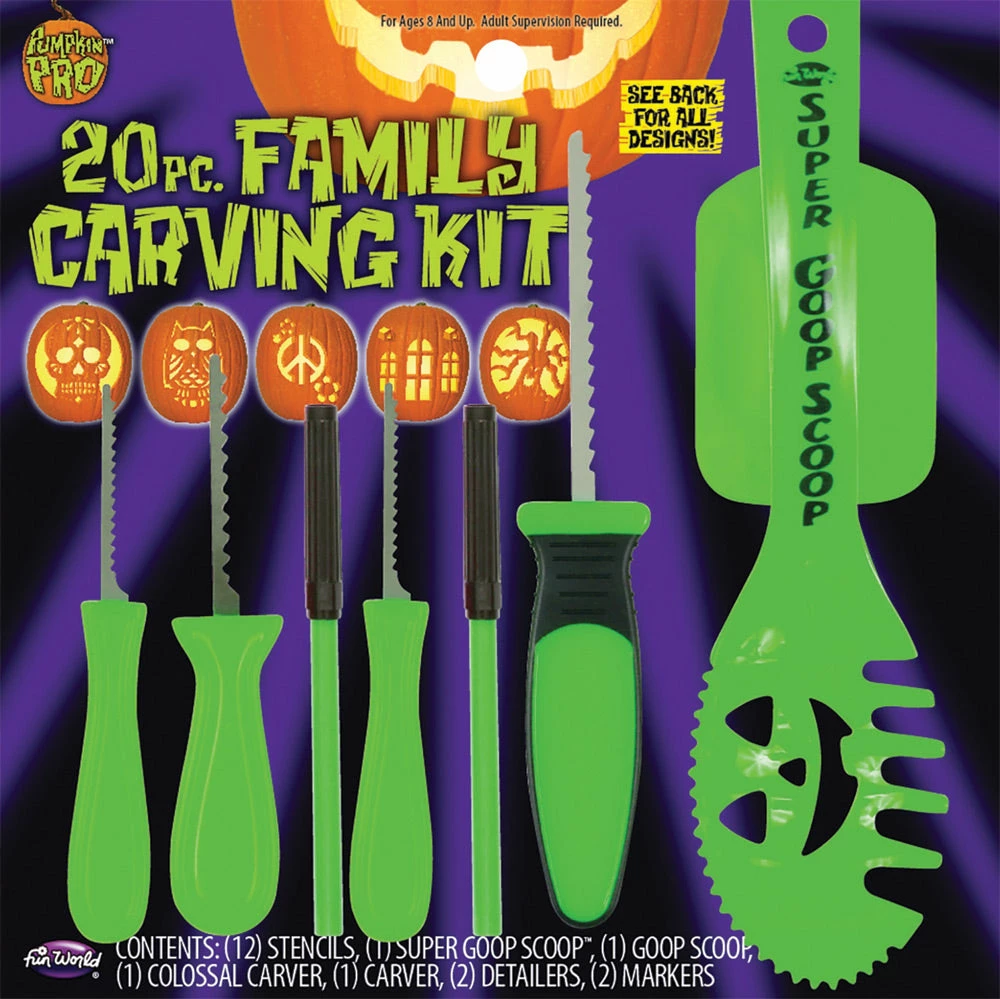 Everything you need to make your special Jack O Lanterns! 20-piece Carving Kit contains 12 stencils, 1 pumpkin scoop, 1 large saw, 2 detailer saws, 1 colossal carver, 1 10 inch Super Goop Scoop, and 2 markers. All you need is the pumpkin!