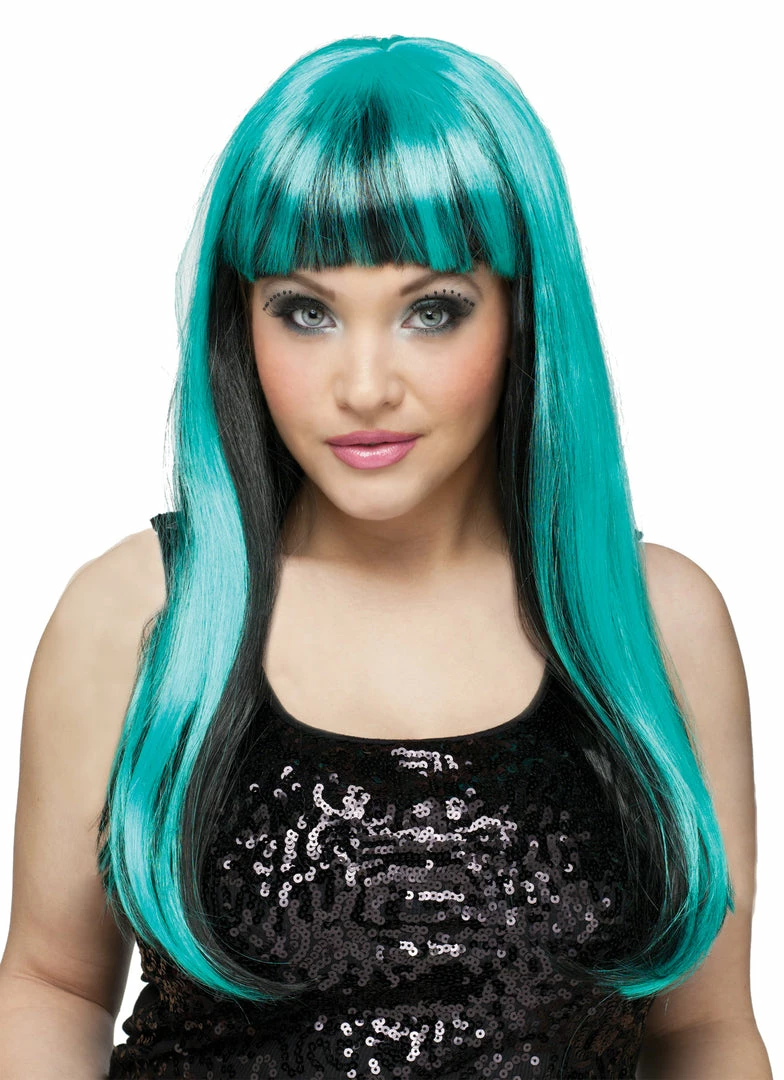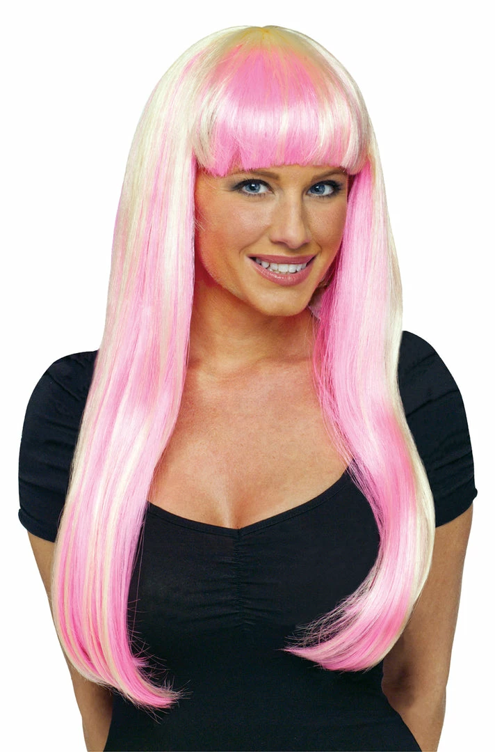 Long, wig with pink highlights and bangs.