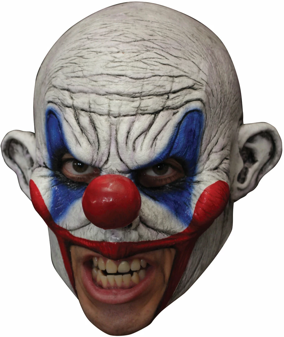 Full over-the-head chinless latex mask of demented clown. One size fits most.