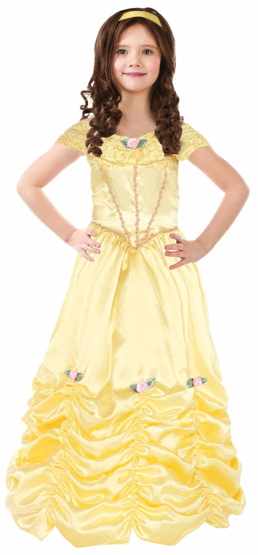 Your little beauty will feel just like a storybook princess in this lovely costume! Floor-length off-the-shoulder yellow satin gown with ruched hem and rosette trims comes with a matching yellow headband. Add your own gloves.