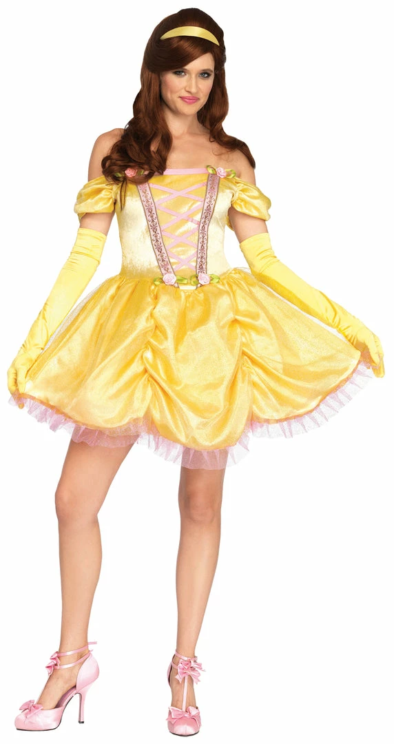 Be the belle of the ball in this lovely off-the-shoulder mini-length ball gown! Yellow satin dress with embroidered ribbon trim and rosette accents has a tulle hemline ruffle. Dress has attached clear shoulder straps. Also includes a matching yellow headband! Add your own gloves and shoes.