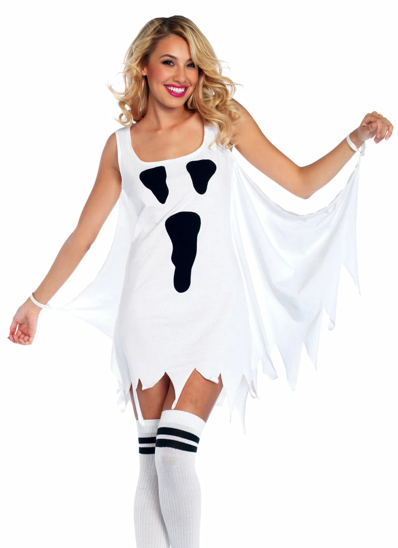 A great simple dress that is perfect for those last minute events. Sexy and simple – it’s just what you need! White jersey with black ghost eyes and mouth design on front. Black/white. Leggings and boots not included.