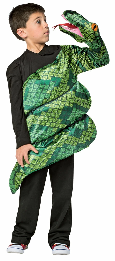 Clever and creative, this anaconda costume features a tunic that looks like a giant green snake coiled around you! One of the sleeves is the snake head so you can make the snake come alive! Add your own pants and shoes. Fits children sizes 7 to 10.
