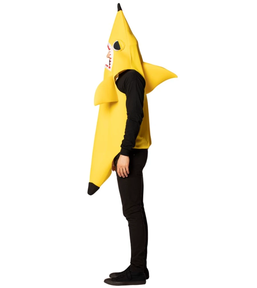 Shark fruit, fish costume! Tropical fruit has never looked so fierce! Designed to wear over your clothing with exposed hands and open face for party friendly fun. This Banana Shark Halloween Costume is constructed of a polyfoam front and poly-knit back to easily pull over-the-head tunic. It has an open face with good visibility! Just put on over your own clothes for a comfortable, easy costume and go bananas! One size fits most adults. Expertly designed for you with care in the USA.
