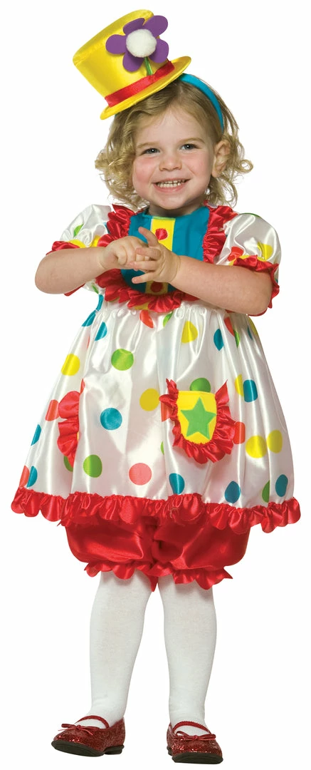 Cute Clown Girl Child Toddler Costume, 3-4T Great complete colorful clown costume is perfect for your little fun-lover! Polka dotted dress with ruffles at neckline, hem and sleeves has a blue inset chest panel with star details at pocket and matching red bloomers. Also includes a headband with bright yellow top hat and flower.