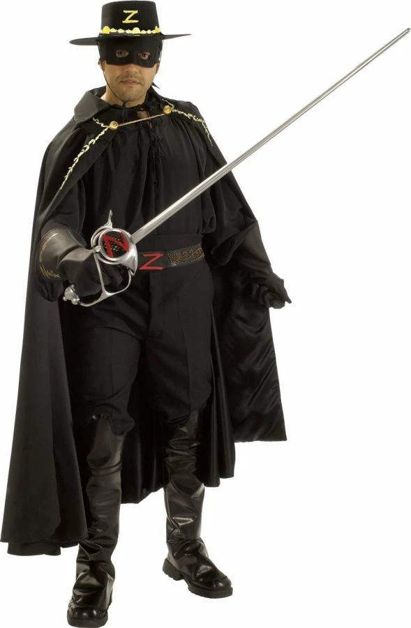 There’s only one cunning black caped outlaw defender of the people and Spanish hero to all…Zorro! Includes nicely weighted polyester cape with chain and fasteners that velcro in place. Cape has satin lining and measures 53 inches long. Shirt come with string to tie up shirt at top, and over size cuffs and buttons. Pants has elastic waist for a comfortable fit. This costume is not for the weak! Hat has an embroidered golden Zorro insignia on top of hat, with same golden design all around the shoulder of the hat. Black roped string attached to hat for an added authentic look. Matching golden print, with Zorro design, are on belt and gloves. Molded eye mask has tie closure and soft lining, to fit and lay comfortably on your face. Faux leather boot tops completes this unstoppable look.