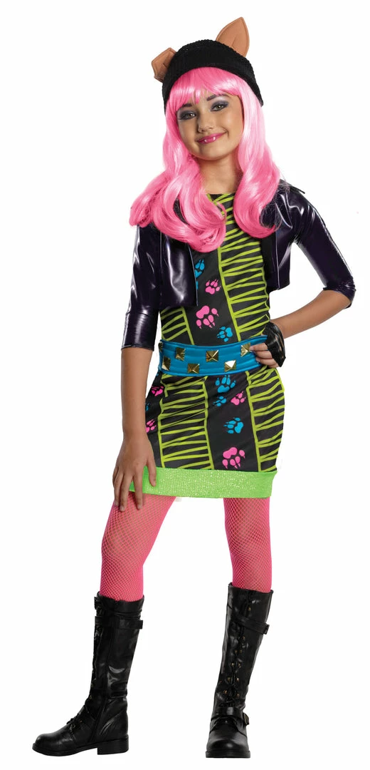 Very colorful costume modeled after the popular Monster High character. Dress with attached bolero jacket belt glove and tights. Shoes and wig not included.