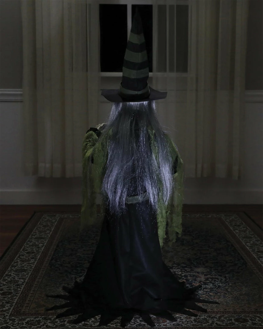 Halloween Witch prop. Her beady yellow eyes glow while she grasps a luminous mystical orb that radiates alternating colors