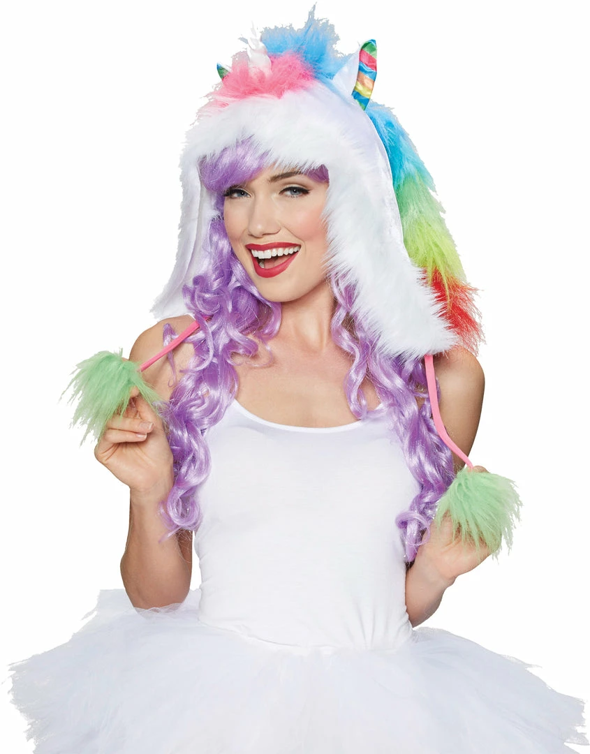 Stylishly cute furry hoods with dangling pom-pom accents. Complete your costume look with this hooded wonder. One size fits most adults.