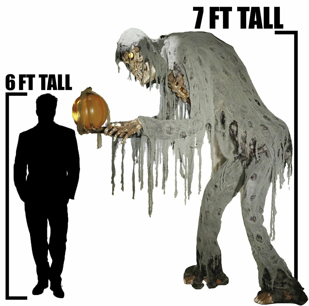 Prowling Jack Animated Prop is a Giant Skeletal Creature cloaked in rotting ragged ancient-looking clothing with dangling shredded gauze that moves with every spooky breeze! He silently waits for his victims to come closer before he begins to speak in a menacing raspy Voice. Clutched in his right hand a bright Orange Pumpkin comes to life with an Inner Projection Light that illuminates his Jack O Lantern face with animated features as he speaks! Together they Laugh while exchanging creepy amusing banter. Prowling Jack’s Eyes and Chest light up and his Jaw moves while he speaks. His left arm moves back and forth to emphasize his words.. Prowling Jack can be activated either through an infrared motion sensor or step-here pad and can be set to run continuously for scares that never end! They speak many phrases that will draw attention and bring people close, a perfect attention getter for haunted houses or storefronts. Assembly is a quick and easy. Everything you need for set up comes in one package, simply slide together the quick connect poles, snap together the electrical connections and plug in to the wall. Ready to go!
