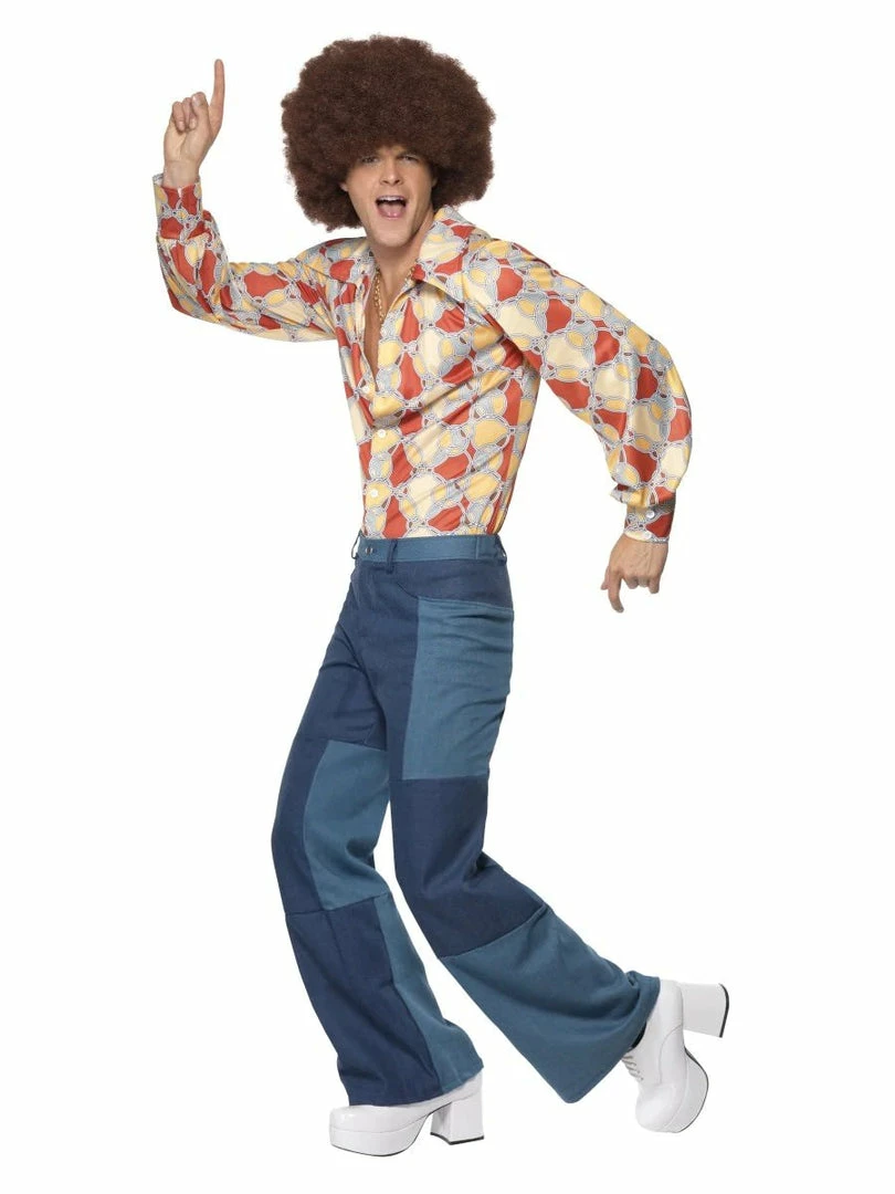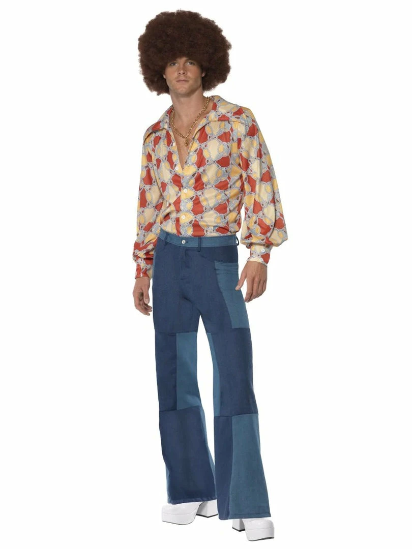 70s Retro Costume, Blue, Shirt & Patchwork Denim Trousers