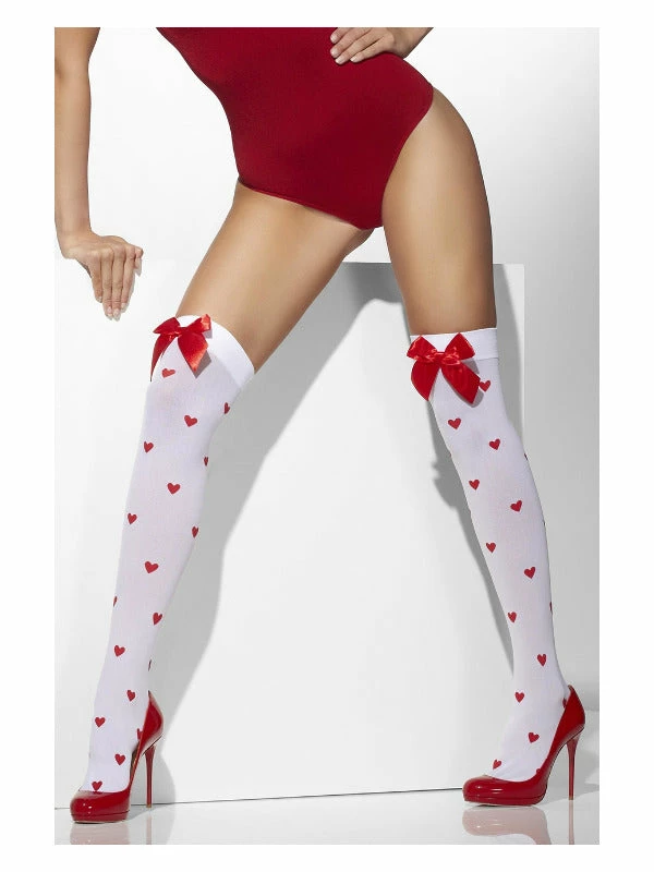 Complete your dress-up costume with the White Opaque Hold-Ups featuring gorgeous Red Bows and Red Hearts . They’ll provide the perfect finishing touch to your outfit. Available in one size. Valentines, Queen of HeartsÂ