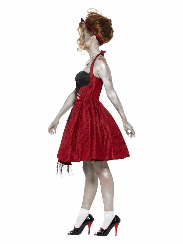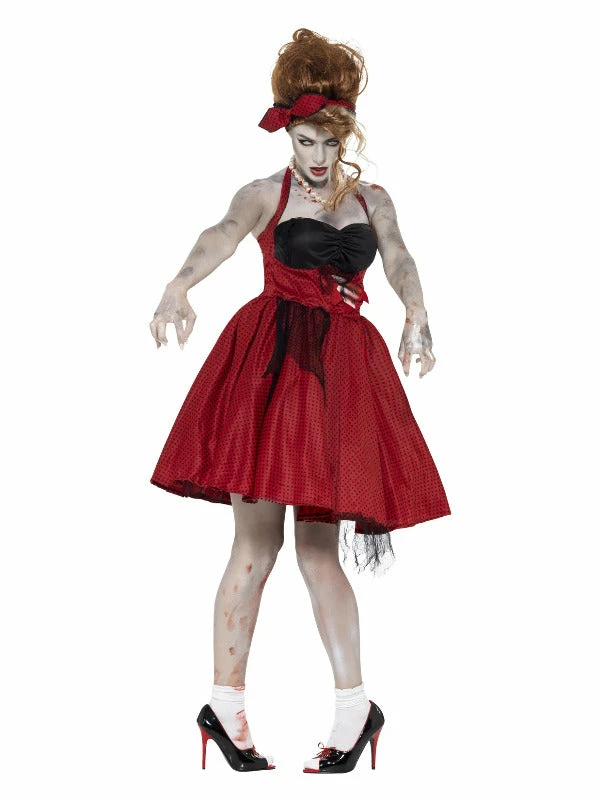Zombie 50s Rockabilly Costume, Red, with Dress with Latex Rib & Headband