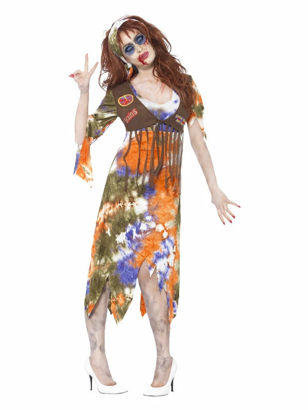 Zombie 60s Hippie Lady Costume, Multi-Coloured, with Dress, Attached Waistcoat & Headscarf