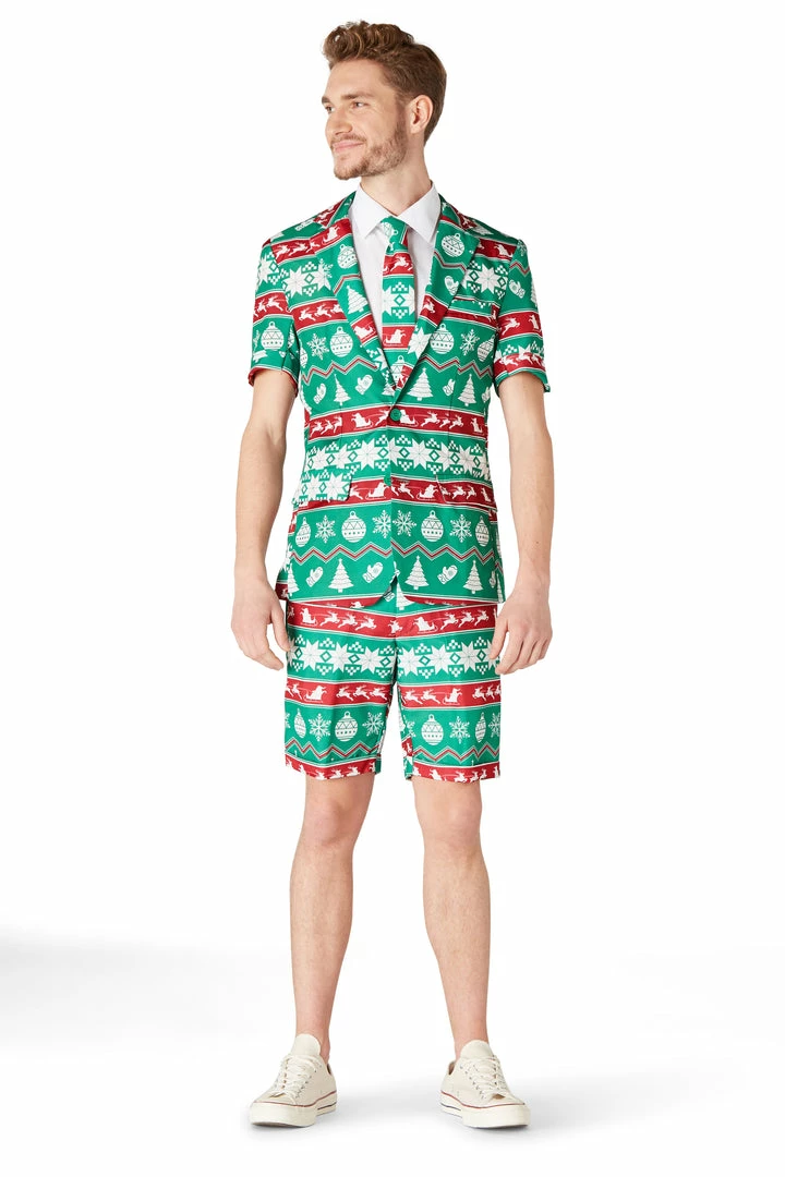 We all know life is for living.. but we believe that you should always have a laugh along the way! You will be sure to get the attention you deserve once you suit up and button up in this polished slim fit Christmas Green Nordic Men’s full matching funky costume suit with shorts. Your confidence will soar as you strut your stuff and head out in style. Party the night away, or add some spice and bring life and flare to the office. You’ll definitely be turning heads on that special date or celebration. Dare to be different, be seen, be bold, and we can guarantee you will make some memories along the way.. You’re Welcome!Â