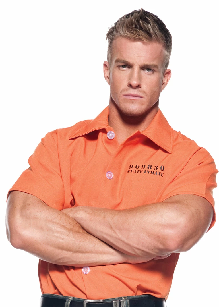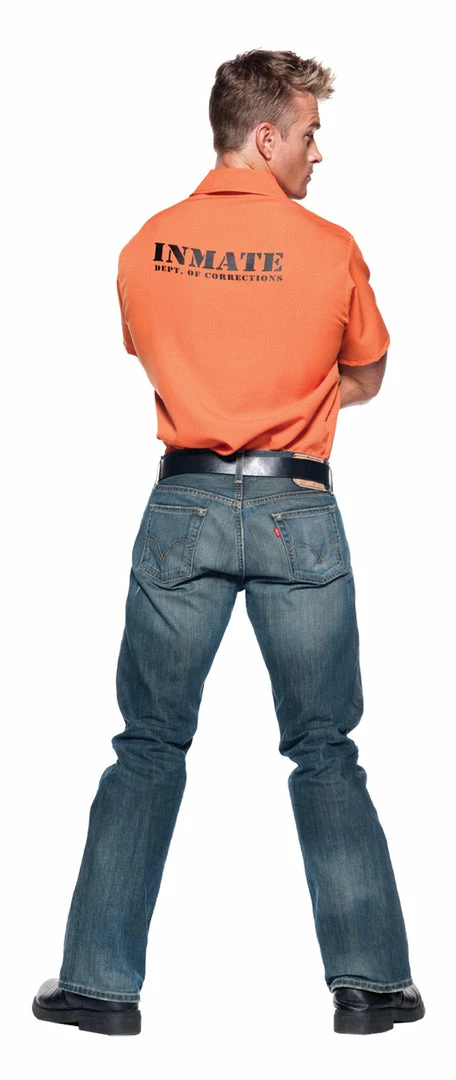 Bright orange shirt with inmate number printed right on the front. Just add your own jeans!