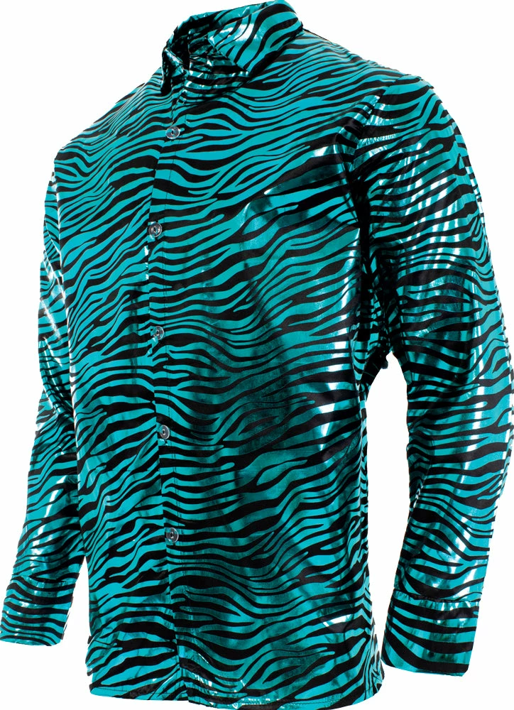 Show off your wild side and be the King in this funky Tiger shirt. Become the king of the jungle when you step out in this shiny blue and black sleeve shirt.