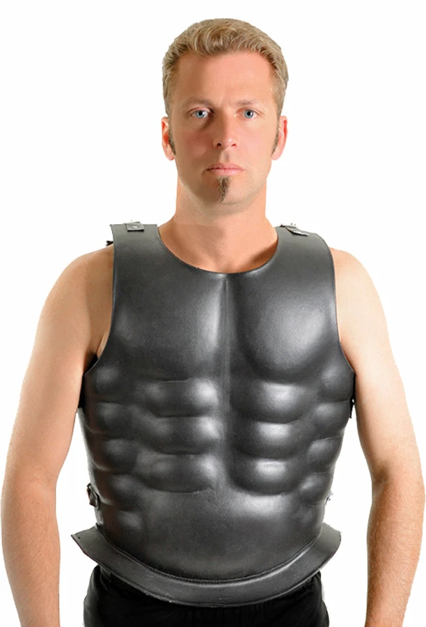 Body armor cast to fit the wearer’s torso and designed to mimic an idealized human physique commonly depicted in Greek and Roman art. This simple cuirass was worn in combat situations. 18 gauge steel with leather adjustable side and shoulder straps menacing black color. 15 lbs. Fits 44-48 inch chests.